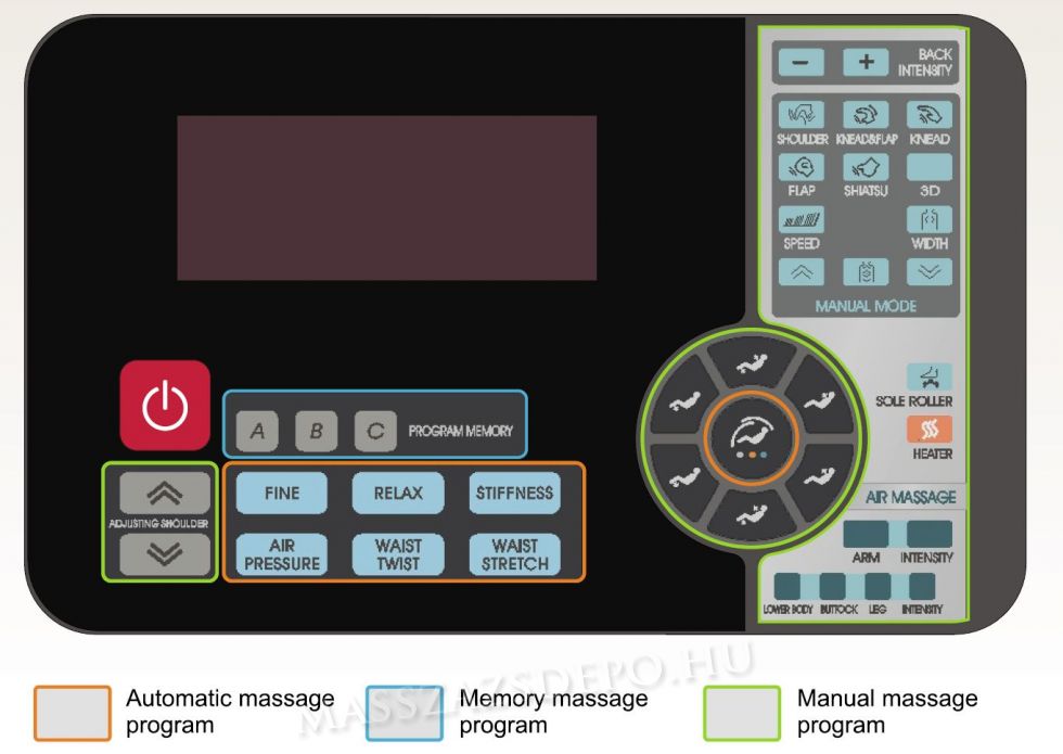 A légpárnás masszázs erőssége 3 fokozatban állítható. Kikapcsolható. - Felsőtest masszázs rendszere